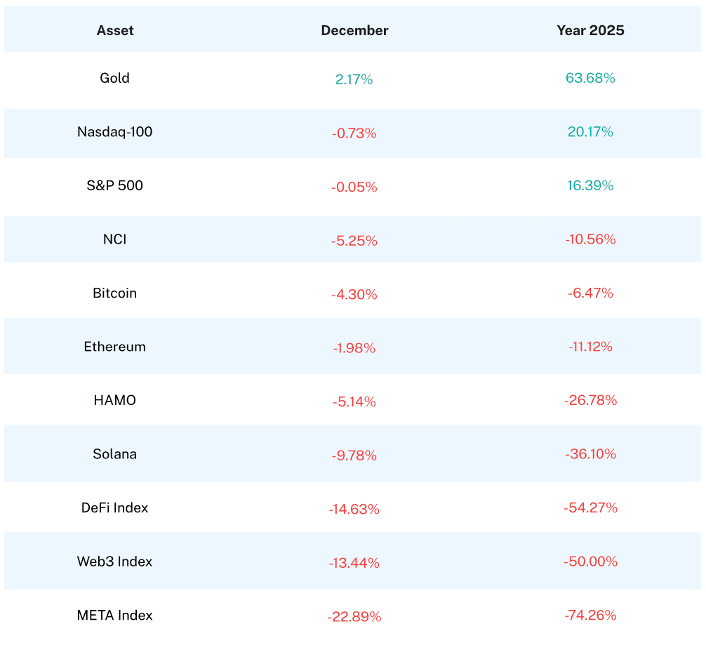 Thematic indices showed mixed December performance. The Smart Contract Platform (Web3) index gained 5.24% on Ethereum's Fusaka momentum, while the Decentralized Finance (DeFi) index rose 3.15% as total value locked reached a record $237 billion. The Vinter Hashdex Risk Parity Momentum (HAMO) index added 2.08%, its systematic approach capturing the stabilization. The Digital Culture (META) index declined 1.82%, extending its -67.23% annual loss—a stark reminder of speculation's perils.