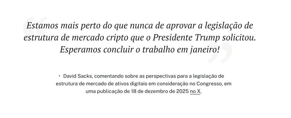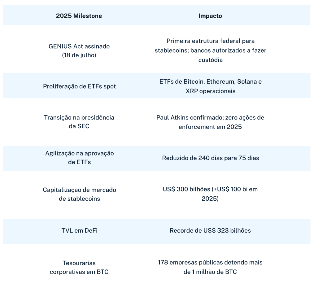 2025 não será lembrado por seus retornos, mas pelo que construiu. O GENIUS Act trouxe clareza para stablecoins. A proliferação de ETFs democratizou o acesso. As estruturas regulatórias se solidificaram. A custódia institucional amadureceu. As tesourarias corporativas acumularam. Esses desenvolvimentos — invisíveis nos gráficos de preço — criam a infraestrutura que sustenta a próxima fase de crescimento cripto.
