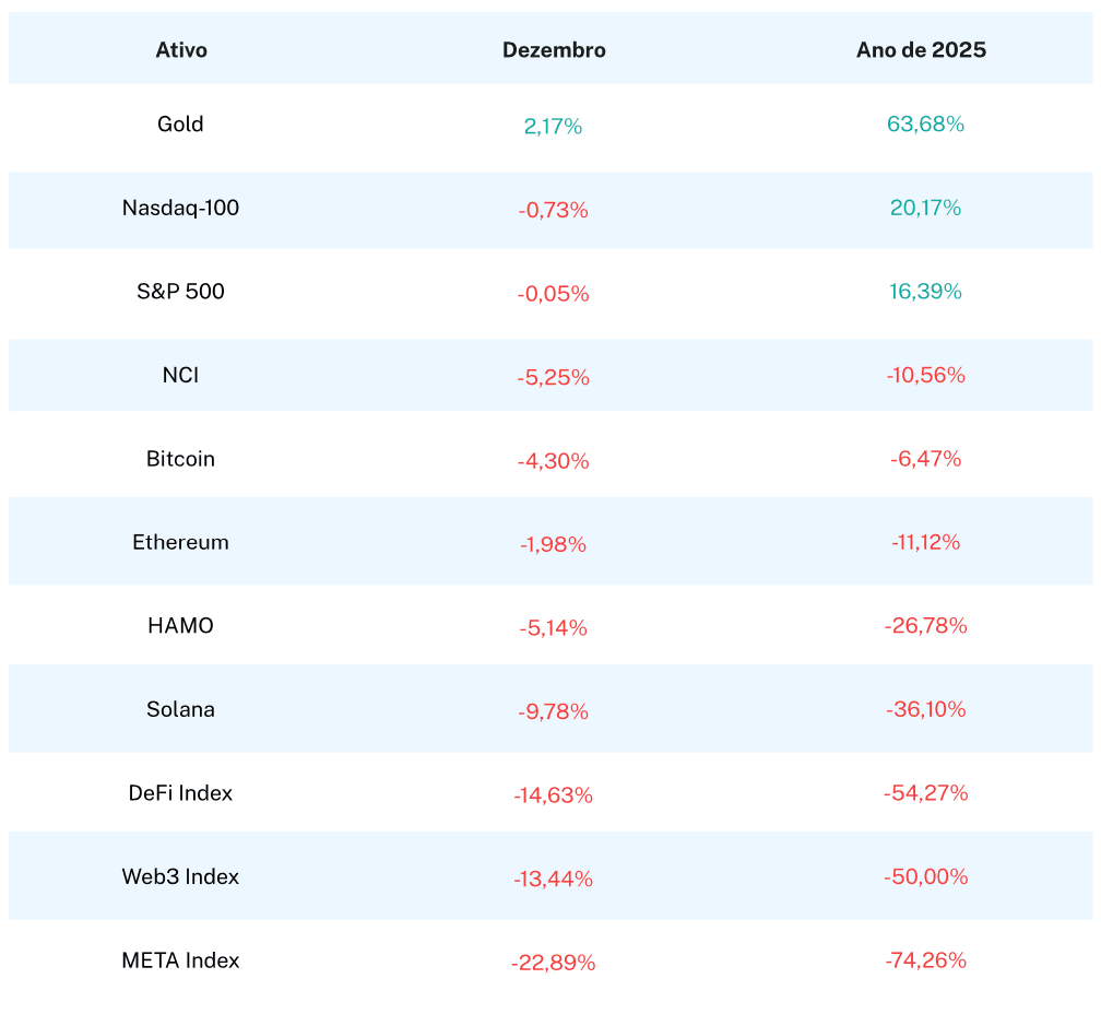 Os índices temáticos apresentaram desempenho misto em dezembro. O índice Smart Contract Platform (Web3) ganhou 5,24% com o momentum do Fusaka do Ethereum, enquanto o índice Decentralized Finance (DeFi) subiu 3,15% com o valor total bloqueado atingindo o recorde de US$ 237 bilhões. O índice Vinter Hashdex Risk Parity Momentum (HAMO) adicionou 2,08%, com sua abordagem sistemática capturando a estabilização. O índice Digital Culture (META) caiu 1,82%, estendendo sua perda anual de -67,23% — um lembrete claro dos perigos da especulação.