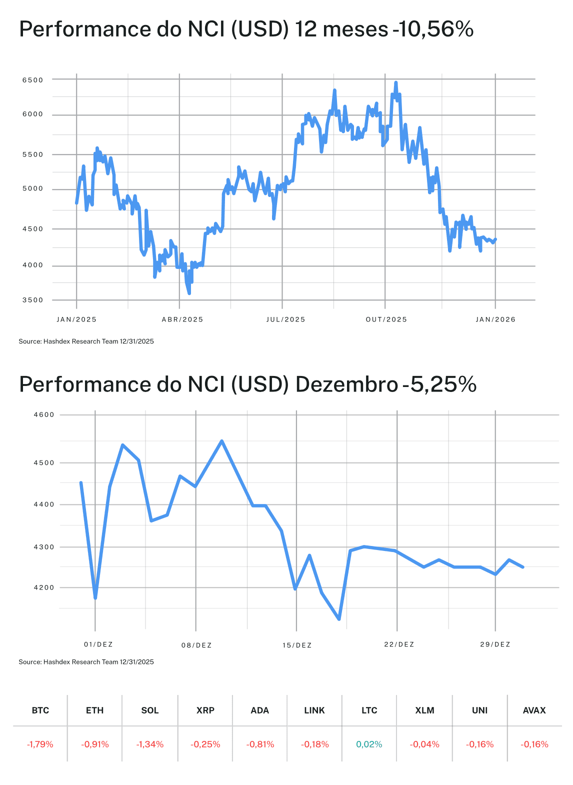 Os números contam uma história; a infraestrutura conta outra. Enquanto o NCI encerrou 2025 com queda de 1,95% e o Bitcoin caiu 3,47%, o ano transformou fundamentalmente a base institucional cripto: